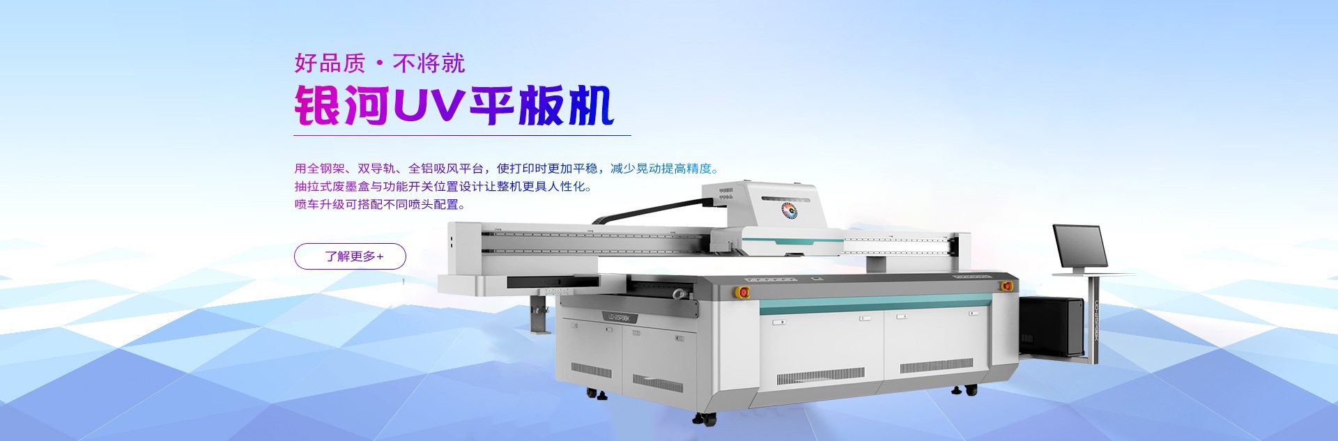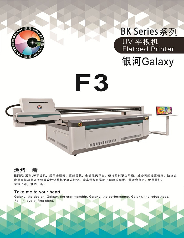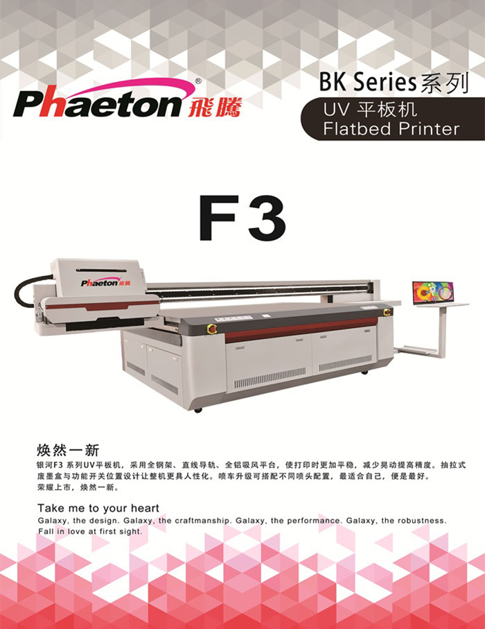 銀河F3系列UV平板機(jī),采用全鋼架、直線導(dǎo)軌、全鋁吸風(fēng)平臺(tái),使打印時(shí)更加平穩(wěn),減少晃動(dòng)提高精度。抽拉式廢墨盒與功能開(kāi)關(guān)位置設(shè)計(jì)讓整機(jī)更具人性化。噴車升級(jí)可搭配不同噴頭配置,最適合自己,便是最好。 榮耀上市,煥然一新。